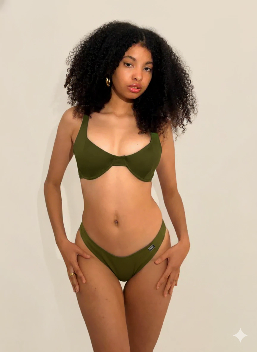 Tiene escote redondo y aro. Breteles anchos ajustables para mayor agarre. La bombacha es colaless y tiene un avío marcario a un costado. Los bordes tienen elástico super resistente para que no se estire.